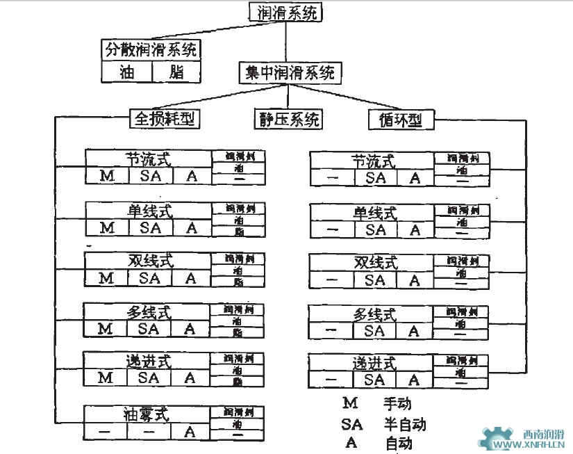 润滑系统是向机械设备的摩擦点输送润滑剂的系统,它包括用以输送、分配、调节、冷却、净化以及其压力、流量和温度等参数和故障的指示、报警和监控的整套装置。机械设备使用的润滑系统主要为分散润滑系统和集中润滑系统两大类,具体如图2-4所示: